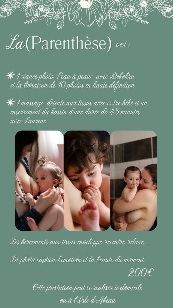 Cette séance Peau à peau peut être couplée avec un soin aux tissus réalisé par Laurène, c’est un moment très enveloppant et ressourçant pour vous et votre bébé, et on trouve cela très complémentaire avec la séance photo, cette offre nous l’avons appelée La (Parenthèse). C’est aussi l’occasion pour les mamans de recevoir un enserrement du bassin en post natal.